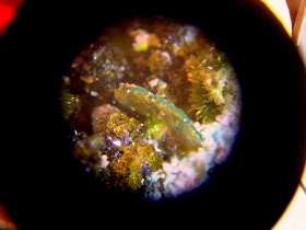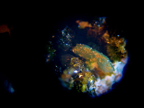 This particular specimen is labeled Pharmacosiderite. The photos below are at 40x taken with a digital camera simply held up to the eye piece.